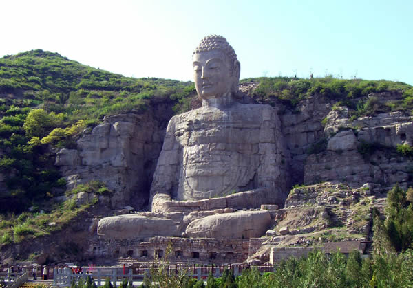 ??? 太原蒙山,位于太原市西南晋源区金胜乡寺底村西北,蒙山主峰海拔1325米,主要景点有蒙山大佛、开化寺、连理塔、御驾桥等。大佛坐高40米,通高(大佛站立高度)66米,佛头高12米、直径8米,重约140吨。据记载,北齐高洋帝于天保二年将东魏大庄严寺扩建为开化寺,开凿了高200尺的摩崖大佛,称为西山大佛,比中外驰名的四川乐山大佛早162年。太原蒙山大佛是我国最早的露天摩崖石刻大佛,比已炸毁的西方公认“世界第一大佛”阿富汗巴米扬大佛高10米。作为山西乃至世界佛教建筑、雕刻史上的一大奇迹,蒙山大佛目前已引起国内有关学界的关注。?