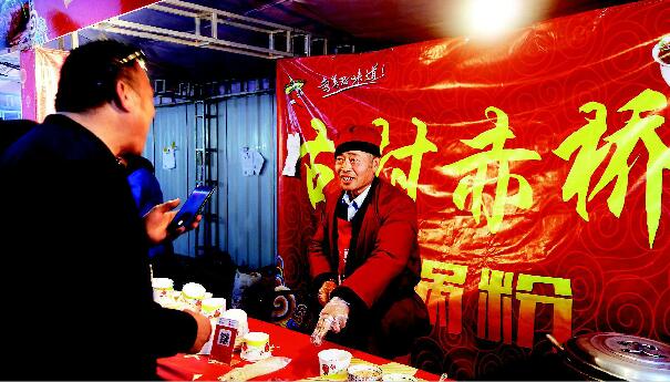 嘉年华上的风味小吃。游人在彩灯前驻足品赏。
